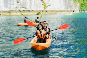 14h45: Quý khách có cơ hội trải nghiệm chèo thuyền kayak hoặc đi thuyền nan thăm Hang Luồn.